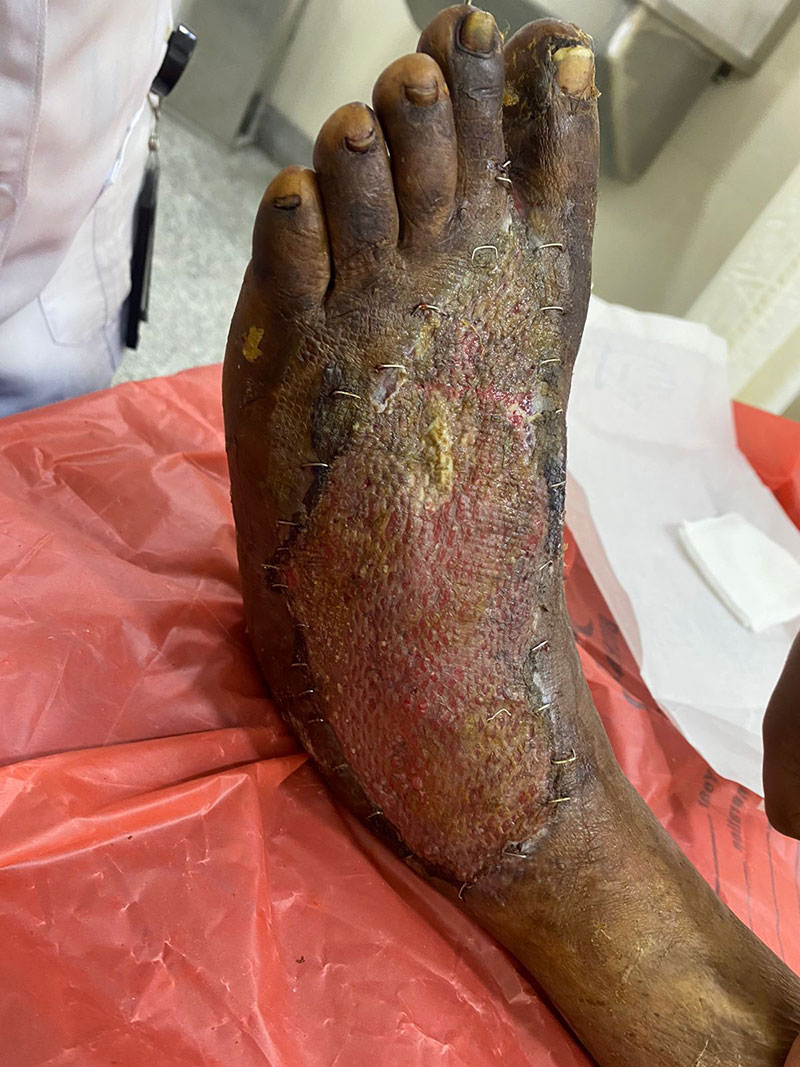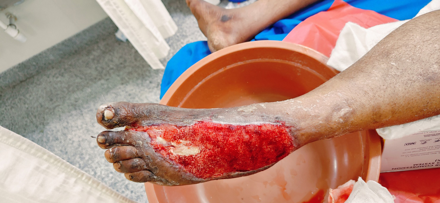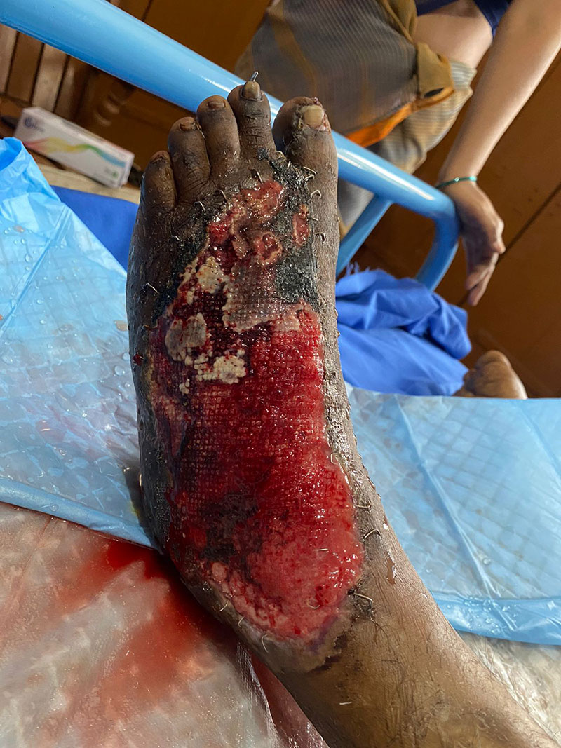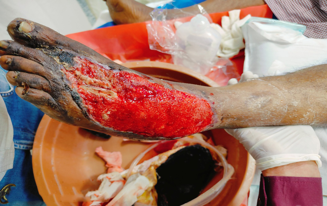 A 65 year old male patient was transferred to the trauma care on day 7 post injury. The dorsal side of the foot was injured and the skin graft applied was not intact. One fourth of the wound showed necrotic tissue. After 1st session i.e., 5 days of therapy with SAC the wound was debrided and the second session was started. After the completion of 2nd session optimal granulation was witnessed and the surgeon has proceeded with skin graft.
